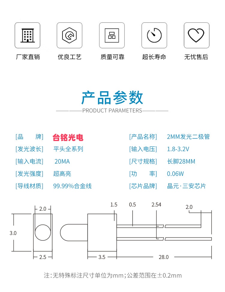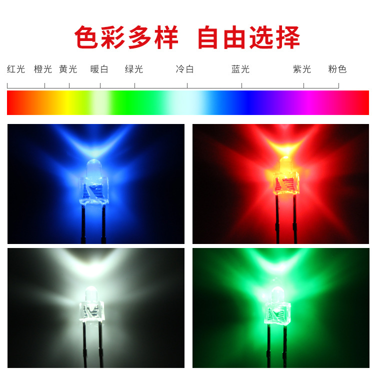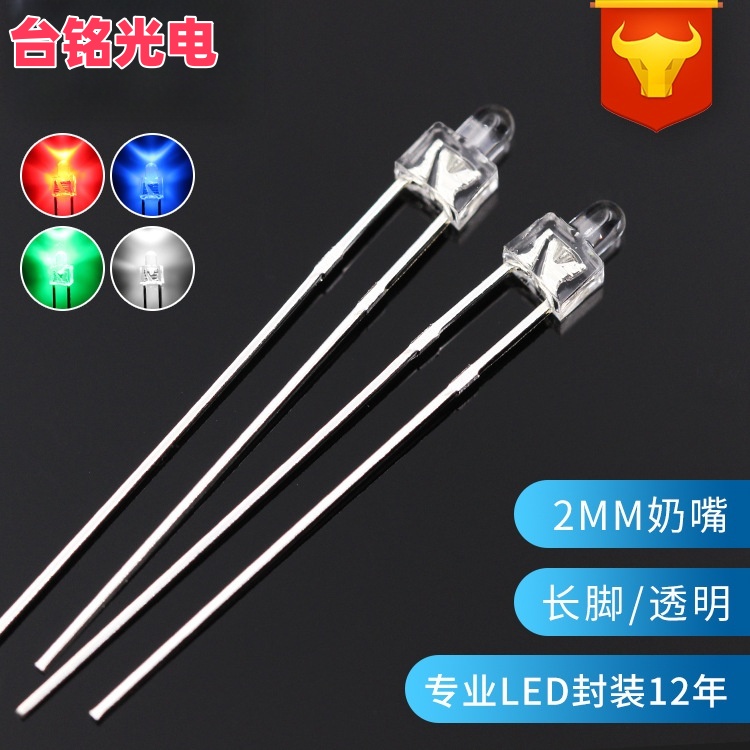 以下是台铭光电 2mm奶嘴型直插LED灯珠(F2透明红/绿/蓝/白光,长脚) 的推荐信息