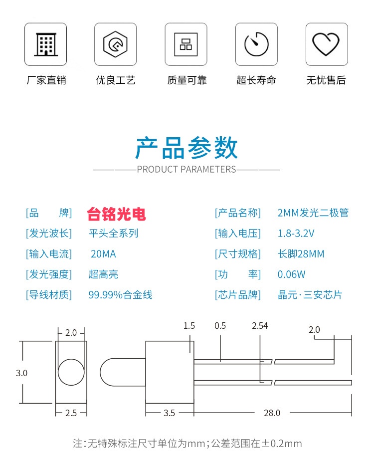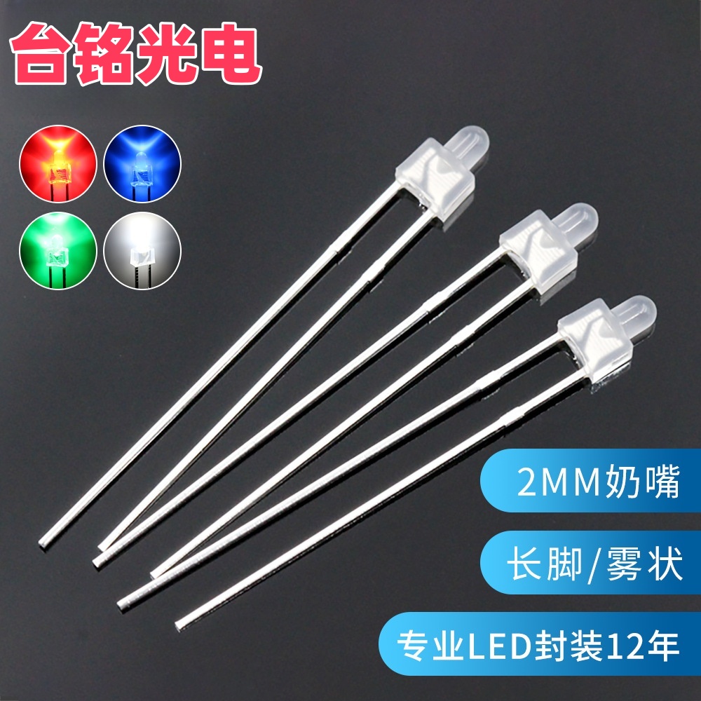 以下是台铭光电 2mm奶嘴型直插LED灯珠(F2透明红/绿/蓝/白光,长脚) 的推荐信息