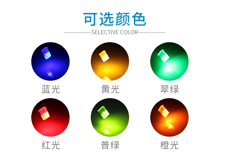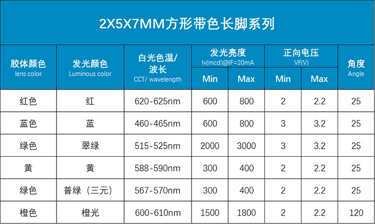 2×5×7mm 方形带色长脚直插LED灯珠(红、蓝、黄、翠绿光) 是一种 中功率DIP LED