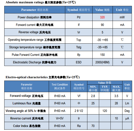 | Type 规格/型号 | Emitting Color 颜色 | Material 原材料 | View Angle 发光角度 | VF(V) 电压 | IV (LM) 亮度 | WL(nm) 波长 | IF(MA) 电流 | |||