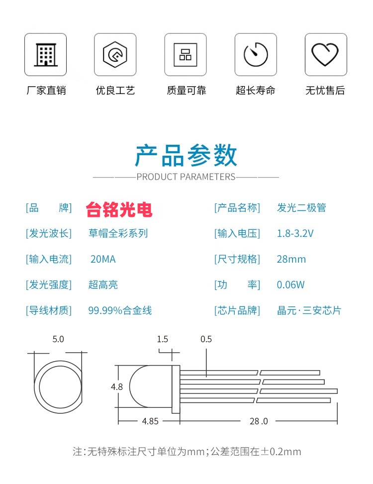 尺寸:直径5mm,圆头直插式。